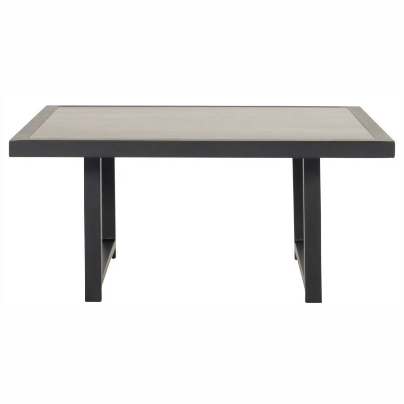 Das Gestell aus pulverbeschichtetem Aluminium ist stabil, wetterfest und rostfrei. Die Tischplatte besteht aus langlebiger Keramik, die kratzbeständig und pflegeleicht ist.