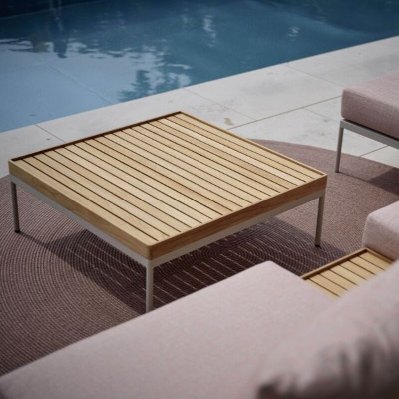 Der Beistelltisch STERN® Coco 80x80x29 cm Aluminium greige mit Teak-Tischplatte ist eine stilvolle Ergänzung für modulare Loungekombinationen im Außenbereich.