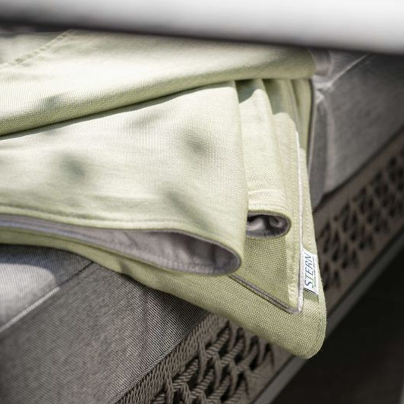 Die Decke von STERN® verbindet Funktionalität und elegantes Design auf harmonische Weise. Mit ihrem freundlichen Farbton Farngrün und der Rückseite in hellem Grau setzt sie dezente Akzente und lässt sich vielseitig kombinieren – sei es im Outdoor-Bereich oder im Wohnzimmer.