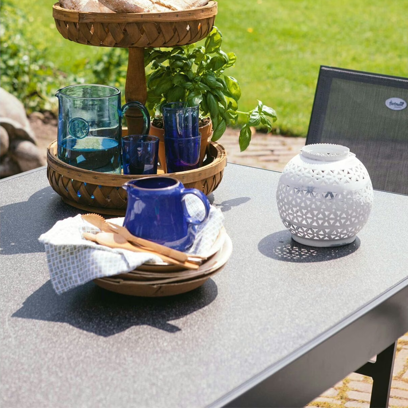 Das Gestell besteht aus pulverbeschichtetem Aluminium. Es ist robust, witterungsbeständig und pflegeleicht. Die Tischplatte besteht aus 5 mm starkem HPL (High Pressure Laminate), das besonders widerstandsfähig gegen Kratzer, Stöße, UV-Strahlen und Feuchtigkeit ist. Die Kanten sind leicht abgerundet, was nicht nur optisch, sondern auch praktisch überzeugt.