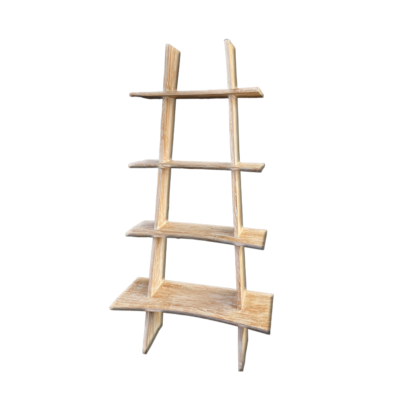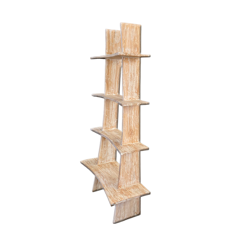 Das Regal überzeugt durch seine markante Form und eine auffällige Linienführung. Die versetzten Böden erzeugen außerdem ein dynamisches Gesamtbild. Die Oberfläche mit Weiß-Patina betont die rustikale Ausstrahlung und verleiht zusätzlich einen hellen, freundlichen Charakter. Jedes Regal wirkt dadurch wie ein kleines Kunstwerk im Raum.