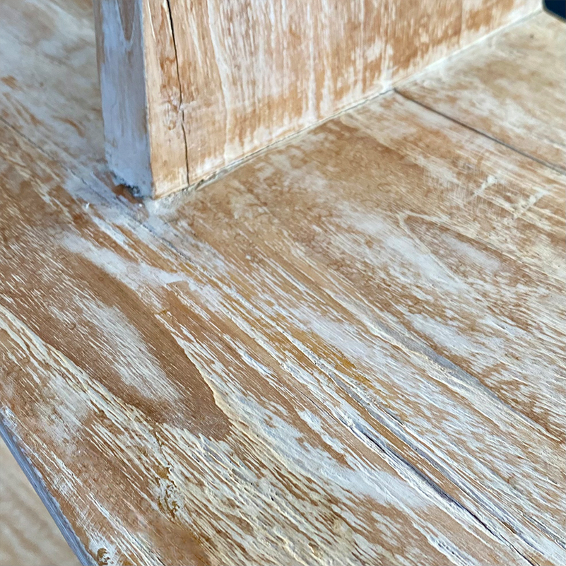Das Möbel besteht aus recyceltem Teakholz, und jedes Stück trägt Spuren seiner Geschichte. Typische Maserungen, kleine Risse und Farbnuancen betonen den individuellen Charakter. Die Weiß-Patina hebt die natürliche Holzstruktur hervor und verstärkt somit den einzigartigen Look. Dadurch bleibt das Regal nicht nur robust, sondern auch optisch besonders.