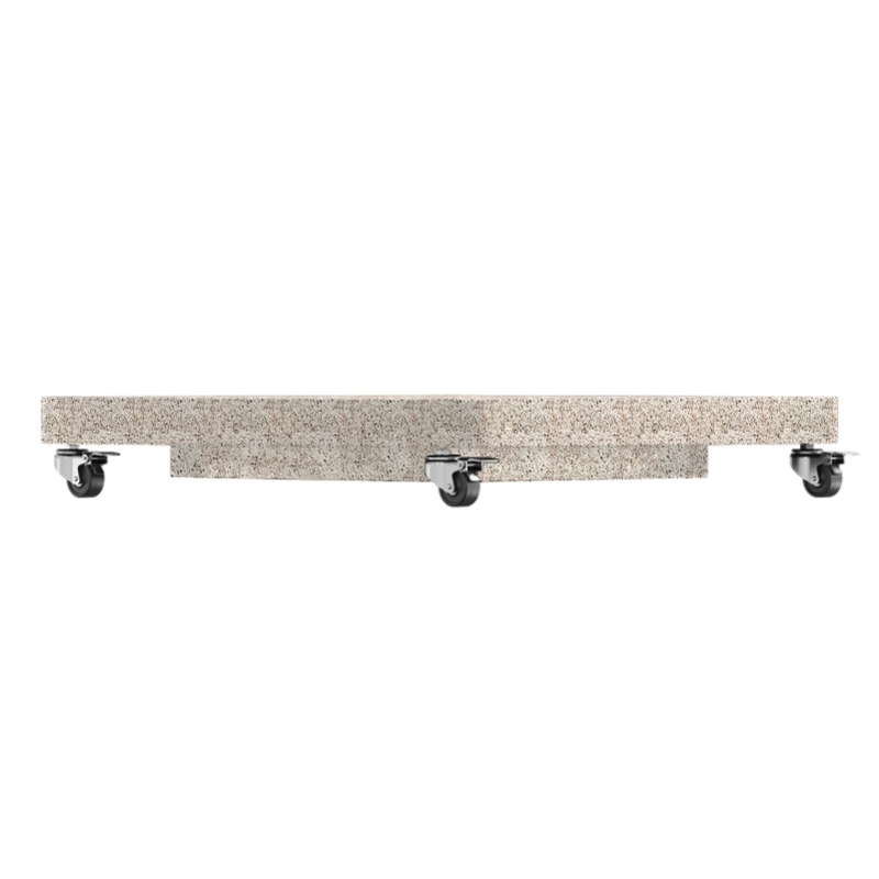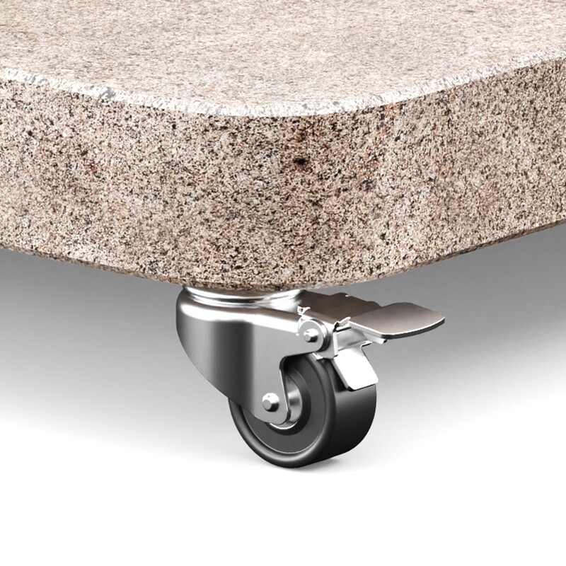 Das Eigengewicht von 90 kg sorgt für hohe Standfestigkeit. Der Schirmständer steht sicher auf Terrasse und Gartenflächen. Schwenkräder erleichtern das Positionieren. Die integrierte Bremse fixiert den Stand zuverlässig.
