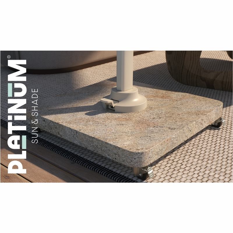 Der Schirmständer wird aus speziell ausgewähltem Granit gefertigt. Die polierte Oberfläche ist pflegeleicht und einfach zu reinigen. Der Naturstein ist widerstandsfähig und langlebig. Das hohe Eigengewicht sorgt für eine sehr stabile Standfestigkeit. Die Schwenkräder erleichtern das Bewegen auf Terrasse oder im Garten. Integrierte Bremsen sorgen für einen sicheren Stand in der gewünschten Position. Der Schirmständer eignet sich für Ampelsonnenschirme von Platinum®, darunter Icon, Challenger, Beaufort, Nexus und Voyager. Die Auswahl des passenden Schirmständers ist abhängig von Größe und Modell des Sonnenschirms und erfolgt beim jeweiligen Produkt auf dieser Website.