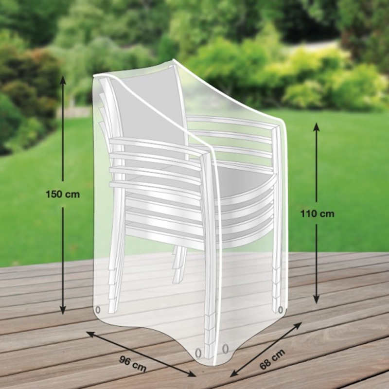 Die Hülle ist passgenau für Stapelstühle und Klappsessel geschnitten. Mit den Maßen 68 × 96 × 110/150 cm eignet sie sich optimal für gängige Modelle. Die dezente Farbe Lichtgrau fügt sich unauffällig in jede Terrasse oder Gartenumgebung ein.