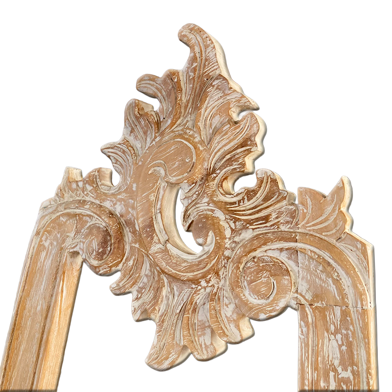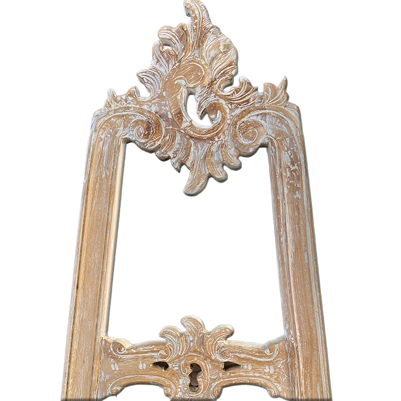 Gefertigt wird das Möbel aus recyceltem Teakholz. Dieses Holz ist robust, langlebig und nachhaltig. Spuren wie kleine Risse oder Farbnuancen bleiben sichtbar und erzählen die Geschichte des Materials. Dadurch erhält jedes Stück seine individuelle Note. Die Weiß-Patina betont außerdem die Maserung und sorgt für eine helle Ausstrahlung. Sie verstärkt den antiken Charakter und verleiht der Staffelei eine zeitlose Wirkung. Die handwerkliche Verarbeitung macht jedes Exemplar einzigartig.