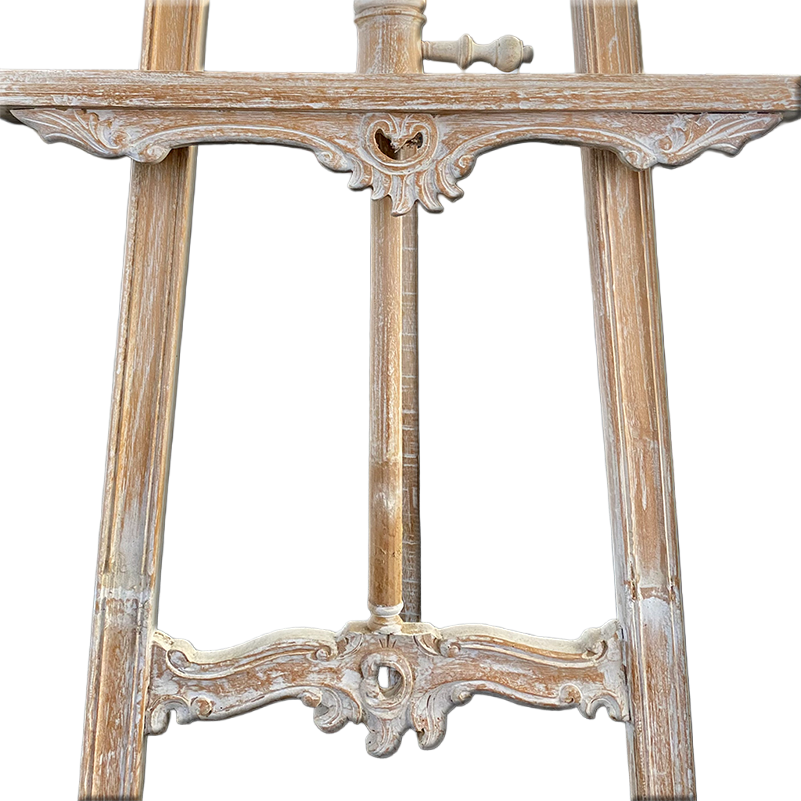 Die Staffelei beeindruckt durch kunstvolle Schnitzereien und detailreiche Ornamente. Der obere Bereich zeigt filigrane, durchbrochene Formen im Rokoko-Stil. Verschnörkelte Linien unterstreichen den dekorativen Charakter zusätzlich. Auch die unteren Partien sind reich verziert und enden in geschwungenen Füßen. Dadurch wirkt die Staffelei besonders edel. Die Gesamterscheinung vermittelt Eleganz und barocken Prunk.